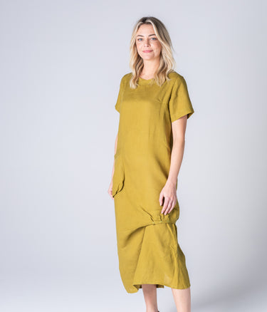 Amandieu is an elegant dress crafted from 100% natural linen. Falling to a flattering mid-calf length, it features a softly draped cowl neckline and a single patch pocket.
