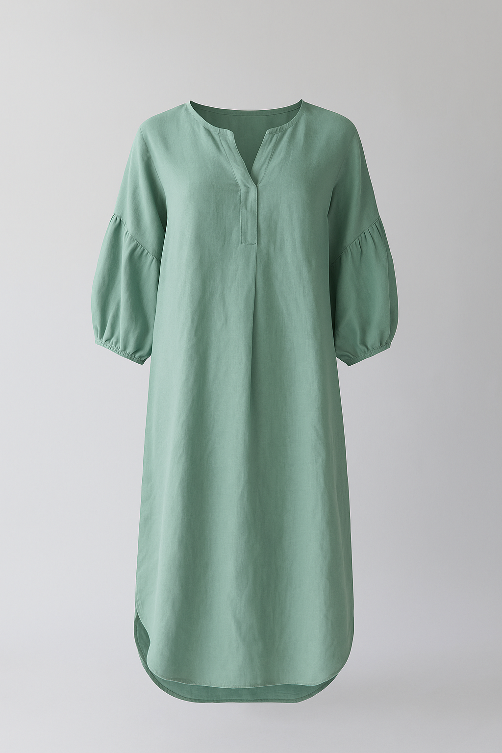 It features a flattering elbow-length blouson sleeve, a comfortable, relaxed fit with a V-neck detail, pockets, and a perfect back design.