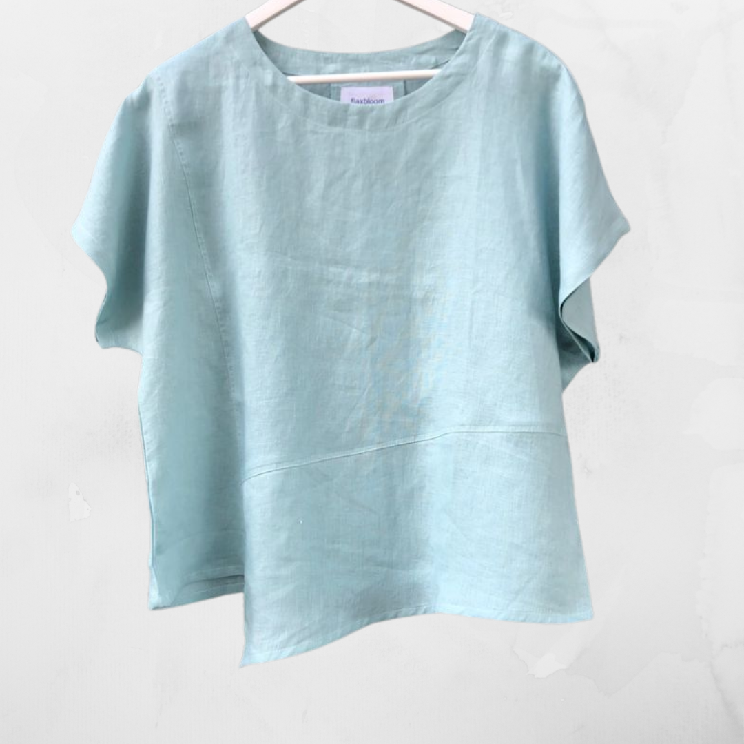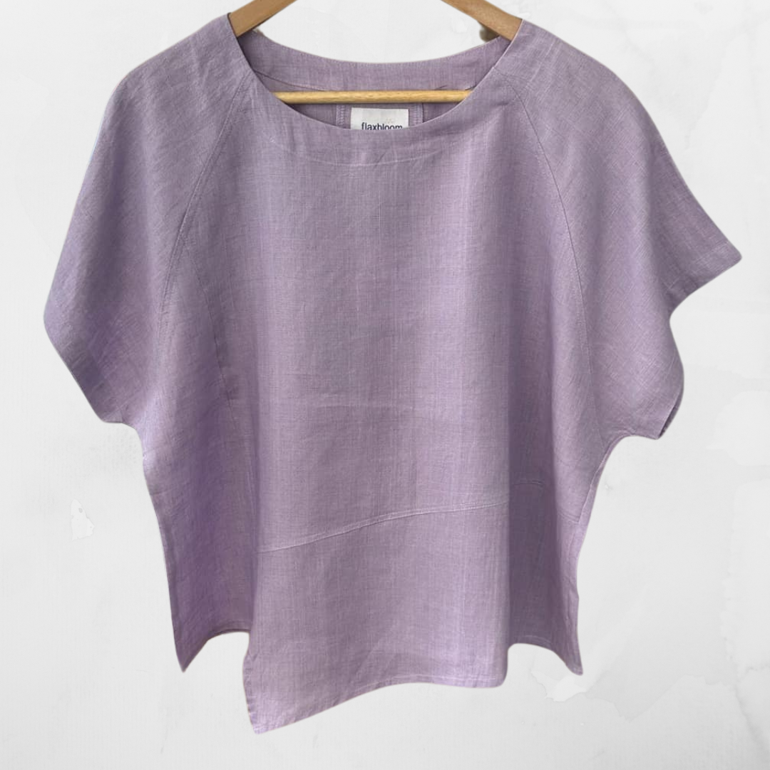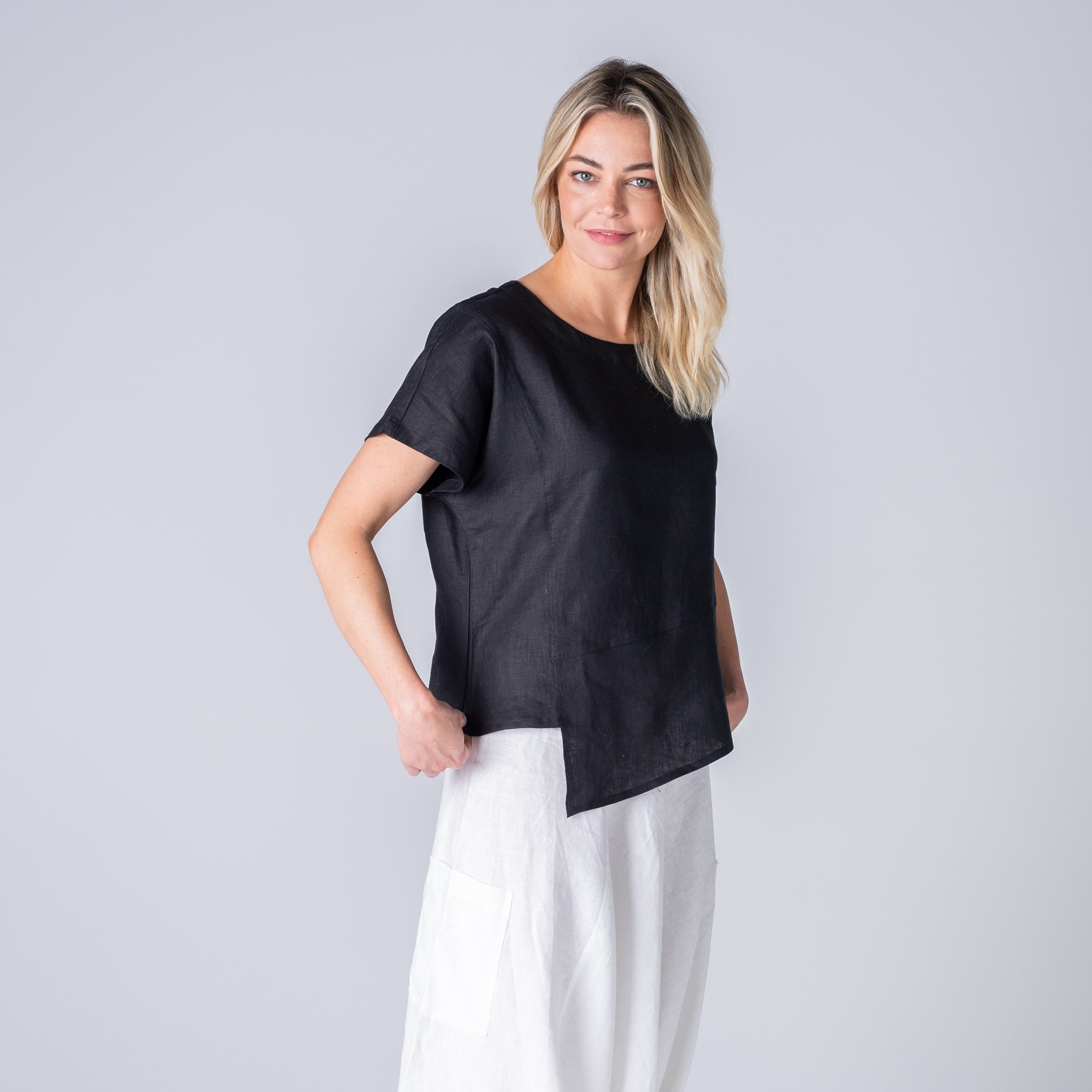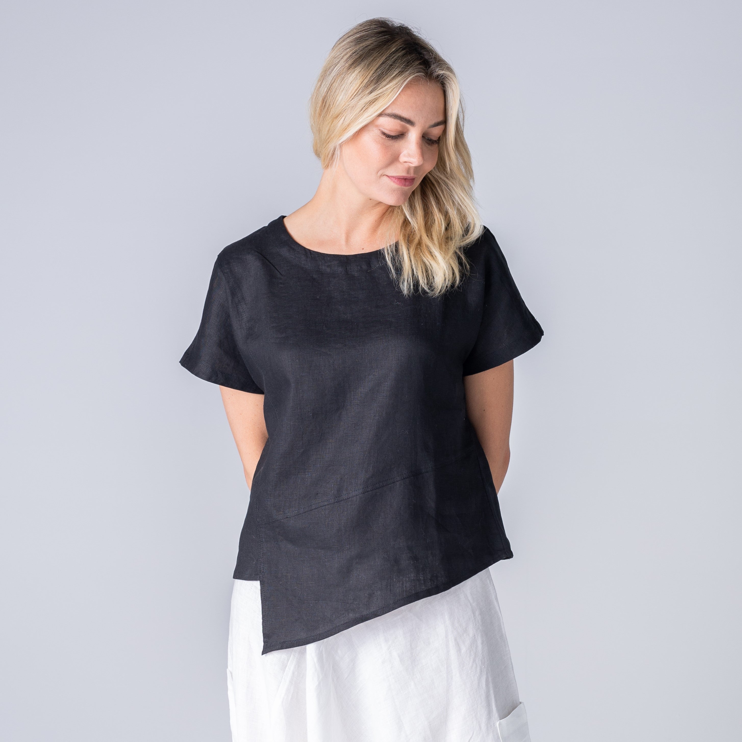 The Violin Linen Top is crafted from soft, pre-washed natural linen and features a relaxed silhouette with a gentle drop shoulder and short sleeves that sit comfortably on the arm. A distinctive asymmetric hem creates movement and visual interest, falling slightly longer on one side for a flattering finish.